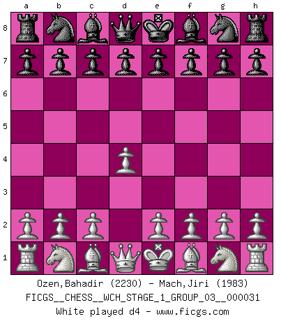 Last move : d4 2026 March 21 15:28:11 White clock - 30 days 08:02:49 Black clock - 29 days 12:17:48 [Event "FICGS__CHESS__WCH_STAGE_1_GROUP_03__000031"] [Site "FICGS"] [Date "2026.03.20"] [Round "1"] [White "Ozen,Bahadir"] [Black "Mach,Jiri"] [Result "*"] [WhiteElo "2230"] [BlackElo "1983"] 1.d4 * Follow this game move after move (download)When the Chess game is over, the Pawn and the King go back to the same box. (Irish saying) Ivan Sokolov treibt mich als Beifahrer an mit go Loeky go - . (Loek van Wely) Bobby Fischer es el mas grande genio de Ajedrez de todos los tiempos. (Alexander Kotov) Plusieurs personnes se sont demandées comment Tal faisait pour gagner... En fait, c'est très simple ! Il met ses pièces au centre de l'échiquier et les sacrifie quelque part ! (David Bronstein) All politicians must be presumed guilty until they are proven innocent. (Dinesh De Silva)