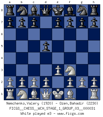 Last move : e3 2026 March 21 20:51:14 White clock - 31 days 03:25:19 Black clock - 30 days 18:37:45 [Event "FICGS__CHESS__WCH_STAGE_1_GROUP_03__000031"] [Site "FICGS"] [Date "2026.03.20"] [Round "1"] [White "Nemchenko,Valery"] [Black "Ozen,Bahadir"] [Result "*"] [WhiteElo "1920"] [BlackElo "2230"] 1.Nf3 d5 2.e3 * Follow this game move after move (download)I have added these principles to the law: get the Knights into action before both Bishops are developed. (Emanuel Lasker) Schach ist eine Sache der genauen Beurteilung, wann man zuschlagen und wann man sich ducken muss. (Robert James Fischer) Ciertamente el estado mental actual de Bobby Fischer es una tragedia. Uno de los mas grandes jugadores de Ajedrez del mundo -el orgullo y pena del Ajedrez Americano. (Frank Brady) Aux échecs, l'amour-propre est satisfait quand on remporte la victoire, mais il n'y a pas de honte à être battu. (Benjamin Franklin) Drag your thoughts away from your troubles... by the ears, by the heels, or any other way you can manage it. (Mark Twain)
