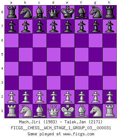 First move 2026 March 20 23:31:0 White clock - 29 days 03:03:02 Black clock - 30 days 00:00:00 [Event "FICGS__CHESS__WCH_STAGE_1_GROUP_03__000031"] [Site "FICGS"] [Date "2026.03.20"] [Round "1"] [White "Mach,Jiri"] [Black "Talek,Jan"] [Result "*"] [WhiteElo "1983"] [BlackElo "2171"] 1.* Follow this game move after move (download)The blunders are all there on the board, waiting to be made. (Savielly Tartakover) Es hat in meinem Leben Zeiten gegeben, in denen das Schachspiel, wenn nicht zum Lebenszweck, so doch zu einem regelrechten Lebensersatz geworden ist. Man fühlt sich in solchen Zeiten nicht so, als besäße man eine göttliche Gabe, sondern eher so, als sei man von ihr besessen. (Garry Kasparov) Una victoria por una combinación errónea, aunque sea espectacular, me llena de horror artístico. (Wilhelm Steinitz) Dieu déplace le joueur, et celui-ci la pièce. Quel Dieu derrière Dieu commence donc la trame ? Arturo Perez-Reverte (prix de littérature policière 1993). Ah, beer! The cause of, and the solution to, all of life's problems. (Homer Simpson)