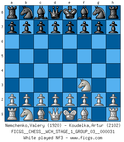 Last move : Nf3 2026 March 21 18:49:28 White clock - 30 days 04:41:32 Black clock - 29 days 13:43:06 [Event "FICGS__CHESS__WCH_STAGE_1_GROUP_03__000031"] [Site "FICGS"] [Date "2026.03.20"] [Round "1"] [White "Nemchenko,Valery"] [Black "Koudelka,Artur"] [Result "*"] [WhiteElo "1920"] [BlackElo "2102"] 1.Nf3 * Follow this game move after move (download)I feel as if I were a piece in a game of Chess, when my opponent says of it: That piece cannot be moved. (Soren Kierkegaard) Im Blitz ist es einfacher mit einer Figur weniger anzugreifen, als sich mit einer Mehrfigur zu verteidigen. (Mikhail Nekhemyevich Tal) El Ajedrez es un juego de pelea el cual es puramente intelectual e incluye la suerte. (Richard Reti) Pour moi, les échecs ne sont pas un jeu mais un art. (Alexandre Alekhine) Wisdom doesn't necessarily come with age. Sometimes age just shows up all by itself. (Tom Wilson)