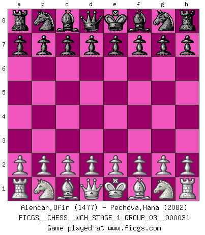 First move 2026 March 20 23:31:0 White clock - 28 days 20:49:49 Black clock - 30 days 00:00:00 [Event "FICGS__CHESS__WCH_STAGE_1_GROUP_03__000031"] [Site "FICGS"] [Date "2026.03.20"] [Round "1"] [White "Alencar,Ofir"] [Black "Pechova,Hana"] [Result "*"] [WhiteElo "1477"] [BlackElo "2082"] 1.* Follow this game move after move (download)There are two types of sacrifices: correct ones and mine. (Mikhail Tal) Gewöhnliche Menschen denken nur daran, wie sie ihre Zeit verbringen. Ein intelligenter Mensch versucht, sie auszunutzen. (Arthur Schopenhauer) Ayuda a tus piezas para que ellas te puedan ayudar. (Paul Morphy) Je menace de comprendre la position. (Anonyme) There is no instance of a country having benefited from prolonged warfare. (Sun Tzu)