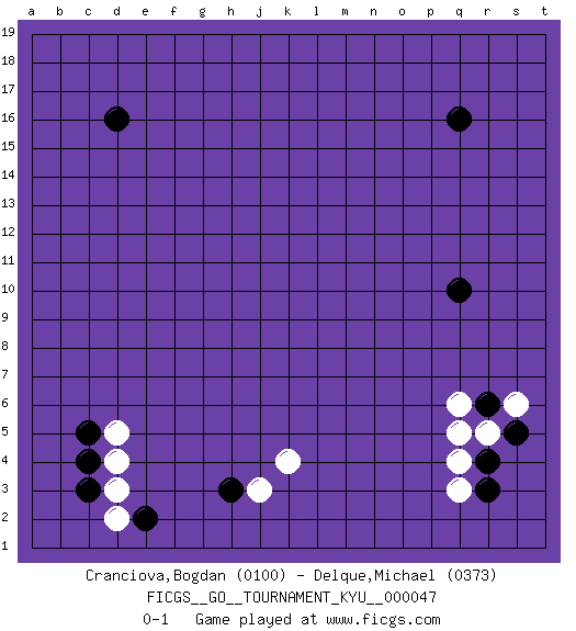 Last move : 0-1 2007 December 2 20:7:7 [Event "FICGS__GO__TOURNAMENT_KYU__000047"] [Site "FICGS"] [Date "2007.10.15"] [Round "1"] [Black "Cranciova,Bogdan"] [White "Delque,Michael"] [Result "0-1"] [Rating 1 "0100"] [Rating 2 "0373"] 1.q16 d3 2.d16 q4 3.c5 d5 4.c4 d4 5.c3 k4 6.r6 q6 7.r4 r5 8.s5 q5 9.r3 q3 10.h3 j3 11.e2 d2 12.q10 s6 0-1 This go game has been lost on time (started : 2007.10.15 16:28:57) Here are the names of the openings (joseki) played in the four corners : Corner d4 : d3 c5 Komoku (Somok, Xiao~mu`) 3-4 Point. The komoku (3-4) point is the traditional corner enclosure move.. Ikken Kakari (Hankan Keolch'im, Yi Gua`jiao~, 1-Space Low Pincer). The small knight move is the basic approach move to the 3-4 point stone. It has been continually used for over four centuries. There are limitless variations, with new moves constantly being discovered. Black 2 opens the door to a treaure store of joseki. Corner q4 : q4 r6 Hoshi (Hwajeom, Seongjeom, Xingwei`) 4-4 Point. The star or hoshi (4-4) point, emphasizing influence at the potential expense of territory. Ikken Kakari (Hankan Keolch'im, Yi Gua`jiao~, 1-Space Low Approach). Black 2 is the standard approach move to the 4-4. Player White won this Go (weiqi, baduk) game. Follow this game move after move (download)There is death in the hane. (Anonymous) I've lost money so fast in these clubs it's left me reeling. I've read every poker book ever written, but the only way to get better at the game is to go out and play with people who are really good. The problem is, you stand to lose a lot of money doing it. (Matt Damon)