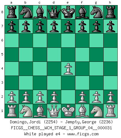 Last move : e4 2026 March 21 12:53:10 White clock - 30 days 10:37:53 Black clock - 29 days 22:13:12 [Event "FICGS__CHESS__WCH_STAGE_1_GROUP_04__000031"] [Site "FICGS"] [Date "2026.03.20"] [Round "1"] [White "Domingo,Jordi"] [Black "Jempty,George"] [Result "*"] [WhiteElo "2254"] [BlackElo "2236"] 1.e4 * Follow this game move after move (download)With or without the title, Bobby Fischer was unquestionably the greatest player of his time. (Burt Hochberg) Konzentriere dich auf materielle Gewinne. Nimm, was dir dein Gegner gibt, ausser es gibt einen guten Grund der dagegenspricht. (Robert James Fischer) Los libros de Ajedrez deben de usarse igual como usamos los anteojos: para mejorar la vista, aunque algunos jugadores los quieren usar como si ellos les otorgaran la vision. (José Raúl Capablanca) Pour se monter efficace, un Cavalier a besoin d'avant-postes ! Les Cavaliers font les meilleurs bloqueurs de pions passés. Gambling is the son of avarice and the father of despair. (French proverb)