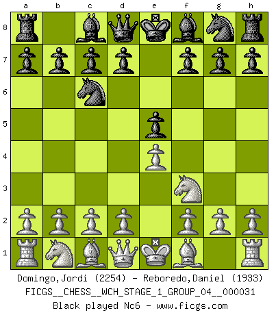 Last move : Nc6 2026 March 21 14:54:52 White clock - 31 days 08:42:44 Black clock - 31 days 22:29:13 [Event "FICGS__CHESS__WCH_STAGE_1_GROUP_04__000031"] [Site "FICGS"] [Date "2026.03.20"] [Round "1"] [White "Domingo,Jordi"] [Black "Reboredo,Daniel"] [Result "*"] [WhiteElo "2254"] [BlackElo "1933"] 1.e4 e5 2.Nf3 Nc6 3.* Follow this game move after move (download)If one piece is badly posted, the whole game is bad. (Tarrasch) Frage: Gibt es etwas was Sie mehr lieben als Autobahnen ohne Tempobegrenzungen? - Antwort: Deutsche Frauen ohne Tempobegrenzungen. (Loek van Wely) Jugadores de primera clase pierden en contra de jugadores de segunda clase porque los jugadores de segunda clase a veces juegan una partida de primer clase. (Siegbert Tarrasch) 'L'échange des dames est un coup dur pour les deux adversaires...' Un journaliste lors d'une partie du match Spassky-Fischer I would love to change the world, but they won't give me the source code. (Unknown)
