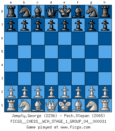 First move 2026 March 20 23:31:3 White clock - 29 days 07:11:56 Black clock - 30 days 00:00:00 [Event "FICGS__CHESS__WCH_STAGE_1_GROUP_04__000031"] [Site "FICGS"] [Date "2026.03.20"] [Round "1"] [White "Jempty,George"] [Black "Pech,Stepan"] [Result "*"] [WhiteElo "2236"] [BlackElo "2065"] 1.* Follow this game move after move (download)Up to this point White has been following well-known analysis. But now he makes a fatal error: he begins to use his own head. (Siegbert Tarrasch) Wenn ein Kopf und ein Buch zusammenstoßen und es klingt hohl, ist es denn allemal im Buche? (Georg Christoph Lichtenberg) El Ajedrez es el arte del análisis. (Mikhail Botvinnik) Vous savez, camarade Pachman, je n'éprouve pas de plaisir à être ministre, je jouerais plutôt aux échecs comme vous, ou alors ferais une révolution au Venezuela. (Che Guevara à Ludek Pachman, 'Checkmate in Prague', 1975) Ah, the Socrating method. The best way we have of teaching everything-apart from juggling chainsaws. (Gregory House, House M.D.)