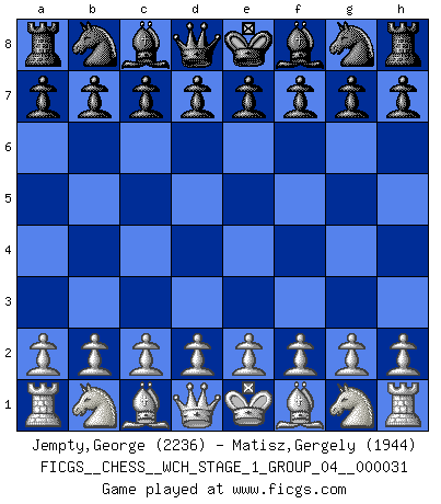 First move 2026 March 20 23:31:3 White clock - 29 days 05:37:39 Black clock - 30 days 00:00:00 [Event "FICGS__CHESS__WCH_STAGE_1_GROUP_04__000031"] [Site "FICGS"] [Date "2026.03.20"] [Round "1"] [White "Jempty,George"] [Black "Matisz,Gergely"] [Result "*"] [WhiteElo "2236"] [BlackElo "1944"] 1.* Follow this game move after move (download)Openings teach you openings. Endgames teach you chess ! (Stephan Gerzadowicz) Der Knackpunkt bei der Konzentration ist, daß wir nur durch sie etwas Neues und Ungewöhnliches am Schachbrett finden können. Sie ist der einzige Weg durch neue neue Ideen eine Überraschung zu bereiten. (Garry Kasparov) El Ajedrez te enseña a controlarl la excitación inicial que sientes cuando vez algo que parece bueno y te enseña a pensar objetivamente cuando te encuentras en problemas. (Stanley Kubrick) Karpov est une pièce de musée. (Garry Kasparov) Luck never made a man wise. (Seneca, Letters to Lucilius)