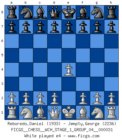 Last move : e4 2026 March 21 13:44:13 White clock - 30 days 09:46:50 Black clock - 29 days 21:34:41 [Event "FICGS__CHESS__WCH_STAGE_1_GROUP_04__000031"] [Site "FICGS"] [Date "2026.03.20"] [Round "1"] [White "Reboredo,Daniel"] [Black "Jempty,George"] [Result "*"] [WhiteElo "1933"] [BlackElo "2236"] 1.e4 * Follow this game move after move (download)Chess is 99 percent tactics. (Teichmann) Nie in meinem Leben habe ich die französische Verteidigung gespielt, welche die Stumpfsinnigste von allen ist. (Wilhelm Steinitz) No solamente yo pronostico su triunfo sobre Botvinnik, sino que me adelanto y digo que probablemente Fischer es el jugador de Ajedrez mas grande que haya existido. (John Collins) Le jeu d'échecs fait naître et fortifie en nous plusieurs qualités précieuses dans le cours de l'existence, telles que la prévoyance, la circonspection, la prudence, et la persévérance. (Benjamin Franklin - 1783, la morale des échecs) Excelling at chess has long been considered a symbol of more general intelligence. That is an incorrect assumption in my view, as pleasant as it might be. But for the purposes of argument and investigation, chess is, in Russkin-Gutman's words, 'an unparalleled laboratory, since both the learning process and the degree of ability obtained can be objectified and quantified, providing an excellent comparative framework on which to use rigorous analytical techniques.' (The Chess Master and the Computer, by Garry Kasparov - 2010)