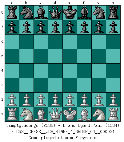 First move 2026 March 20 23:31:3 White clock - 29 days 09:00:14 Black clock - 30 days 00:00:00 [Event "FICGS__CHESS__WCH_STAGE_1_GROUP_04__000031"] [Site "FICGS"] [Date "2026.03.20"] [Round "1"] [White "Jempty,George"] [Black "Brand Lyard,Paul"] [Result "*"] [WhiteElo "2236"] [BlackElo "1334"] 1.* Follow this game move after move (download)Fischer, who may or may not be mad as a hatter, has every right to be horrified. (Jeremy Silman) Im Leben werden Partien nie so unstrittig gewonnen wie im Spiel (Emanuel Lasker) No es tiempo de jugar al Ajedrez cuando la casa esta en llamas. (Proverbio Italiano) Aucun coup ne doit être joué sans but. (Pedro Damiano) An expert is a man who has made all the mistakes which can be made in a very narrow field. (Niels Bohr)