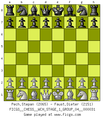 First move 2026 March 20 23:31:3 White clock - 29 days 16:07:17 Black clock - 30 days 00:00:00 [Event "FICGS__CHESS__WCH_STAGE_1_GROUP_04__000031"] [Site "FICGS"] [Date "2026.03.20"] [Round "1"] [White "Pech,Stepan"] [Black "Faust,Dieter"] [Result "*"] [WhiteElo "2065"] [BlackElo "2151"] 1.* Follow this game move after move (download)I give 98 percent of my mental energy to Chess. Others give only 2 percent. (Bobby Fischer) Schach ist Leben. (Robert James Fischer) La partida mas dura de ganar es una partida ganada. (Emanuel Lasker) Mais n'est-ce pas déjà le limiter injurieusement que d'appeler les échecs un jeu? N'est-ce pas aussi une science, un art, ou quelque chose qui, comme le cercueil de Mahomet entre ciel et terre, est suspendu entre l'un et l'autre, et qui réunit un nombre incroyable de contraires ? (Stefan Zweig) When you don't know what to do, walk fast and look worried. (Anonymous)