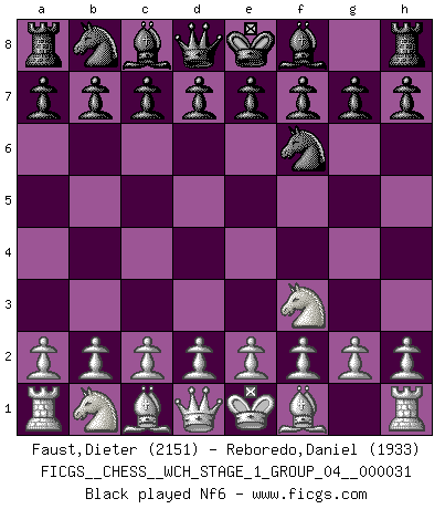 Last move : Nf3 2026 March 21 11:21:52 White clock - 30 days 12:09:11 Black clock - 29 days 22:28:31 [Event "FICGS__CHESS__WCH_STAGE_1_GROUP_04__000031"] [Site "FICGS"] [Date "2026.03.20"] [Round "1"] [White "Faust,Dieter"] [Black "Reboredo,Daniel"] [Result "*"] [WhiteElo "2151"] [BlackElo "1933"] 1.Nf3 * Follow this game move after move (download)That's what Chess is all about. One day you give your opponent a lesson, the next day he gives you one. (Bobby Fischer) Schach ist ein schwarz-weisser Dschungel. (Garry Kasparov) El ganador de una partida es aquel jugador que hace el penúltimo error. (Savielly Tartakover) RxDa4 pat (...) Difficult things take a long time, impossible things a little longer. (Author unknown)