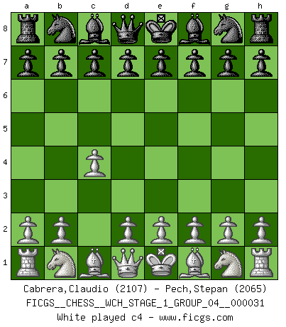 Last move : c4 2026 March 21 0:11:23 White clock - 30 days 23:19:40 Black clock - 29 days 14:12:25 [Event "FICGS__CHESS__WCH_STAGE_1_GROUP_04__000031"] [Site "FICGS"] [Date "2026.03.20"] [Round "1"] [White "Cabrera,Claudio"] [Black "Pech,Stepan"] [Result "*"] [WhiteElo "2107"] [BlackElo "2065"] 1.c4 * Follow this game move after move (download)I'm not afraid of Spassky. The world knows I'm the best. You don't need a match to prove it. (Bobby Fischer) Ohne Fehler kann es keine Brillanz geben. (Emanuel Lasker) Jugadores de primera clase pierden en contra de jugadores de segunda clase porque los jugadores de segunda clase a veces juegan una partida de primer clase. (Siegbert Tarrasch) Les réformistes prétendent que les progrès de la théorie conduiront à la disparition des échecs, et qu'il faut, pour leur rendre vie, en remanier les règles. En réalité, qu'exprime cette affirmation? Le mépris de l'intuition, de l'imagination et de tous les autres éléments qui font des échecs un art. (Alexander Alekhine) Real knowledge is to know the extent of one's ignorance. (Confucius)