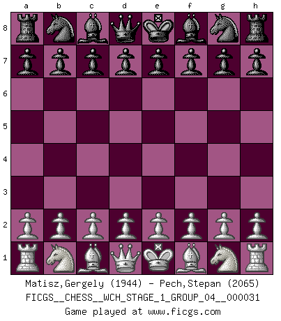 First move 2026 March 20 23:31:3 White clock - 29 days 00:02:53 Black clock - 30 days 00:00:00 [Event "FICGS__CHESS__WCH_STAGE_1_GROUP_04__000031"] [Site "FICGS"] [Date "2026.03.20"] [Round "1"] [White "Matisz,Gergely"] [Black "Pech,Stepan"] [Result "*"] [WhiteElo "1944"] [BlackElo "2065"] 1.* Follow this game move after move (download)A man without frontiers. He didn't divide the East and the West, he brought them together in their admiration for him. (Ljubomir Ljubojevic, about Bobby Fischer's death) Ich organisiere ein großes Turnier, was mich etwa 120000 Dollar kostet. Ich denke, das ist das erste Mal in der Schachgeschichte, daß ein Schachgroßmeister auch als Mäzen auftritt. (Miguel Najdorf) Yo no creo en la psicología. Yo creo en las buenas movidas. (Bobby Fischer) Les échecs, c'est l'imagination. (David Bronstein) See no evil, hear no evil, speak no evil. (The 3 monkeys)