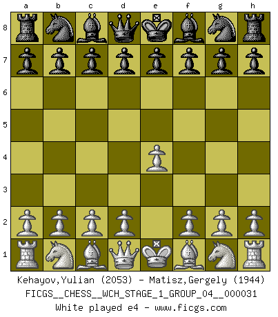 First move 2026 March 20 23:31:3 White clock - 29 days 00:02:53 Black clock - 30 days 00:00:00 [Event "FICGS__CHESS__WCH_STAGE_1_GROUP_04__000031"] [Site "FICGS"] [Date "2026.03.20"] [Round "1"] [White "Kehayov,Yulian"] [Black "Matisz,Gergely"] [Result "*"] [WhiteElo "2053"] [BlackElo "1944"] 1.* Follow this game move after move (download)Of Chess it has been said that life is not long enough for it, but that is the fault of life, not Chess. (William Ewart Napier) Ich verachte die Medien. (Robert James Fischer) Morphy probablemente fue el genio más grande de todos. (Bobby Fischer) Vous savez, camarade Pachman, je n'éprouve pas de plaisir à être ministre, je jouerais plutôt aux échecs comme vous, ou alors ferais une révolution au Venezuela. (Che Guevara à Ludek Pachman, 'Checkmate in Prague', 1975) I find your interest interesting. (Gregory House, House M.D.)