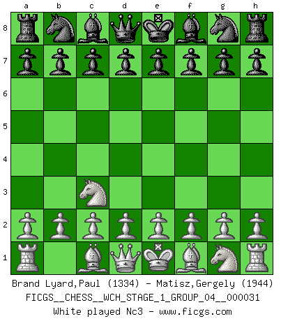 Last move : Nc3 2026 March 21 12:9:13 White clock - 30 days 11:21:50 Black clock - 29 days 12:41:04 [Event "FICGS__CHESS__WCH_STAGE_1_GROUP_04__000031"] [Site "FICGS"] [Date "2026.03.20"] [Round "1"] [White "Brand Lyard,Paul"] [Black "Matisz,Gergely"] [Result "*"] [WhiteElo "1334"] [BlackElo "1944"] 1.Nc3 * Follow this game move after move (download)All I want to do, ever, is just play Chess. (Bobby Fischer) Ohne ihre Erfolge schmälern zu wollen würde ich sagen Petrosian, Spassky und Karpov verdanken ihre Siege ihren Trainern - Boleslavsky, Bondarevsky und Furman. (Mikhail Moiseyevich Botvinik) ¿Cual es el objetivo de jugar una apertura de gambito?... Para adquirir una reputación de ser un jugador apuesto a costo de perder el juego. (Siegbert Tarrasch) Aucun coup ne doit être joué sans but. (Pedro Damiano) It's not the will to win, but the will to prepare to win that makes the difference. (Bear Bryant)