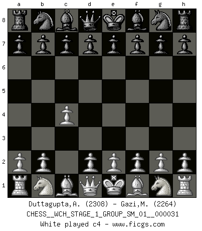 Last move : c4 2026 March 21 14:18:53 White clock - 30 days 09:10:04 Black clock - 29 days 08:02:59 [Event "FICGS__CHESS__WCH_STAGE_1_GROUP_SM_01__000031"] [Site "FICGS"] [Date "2026.03.20"] [Round "1"] [White "Duttagupta,Aniruddha"] [Black "Gazi,Miroslav"] [Result "*"] [WhiteElo "2308"] [BlackElo "2264"] 1.c4 * Follow this game move after move (download)Chess is the art of analysis. (Mikhail Botvinnik) Frage des Reporters: -Worin besteht das Ziel von Gambiteröffnungen? Antwort: -Auf Kosten der Partie einen Ruf als Angriffspieler zu erwerben.- (Siegbert Tarrasch) Después de la respuesta de las negras a 1.e4 con 1..e5, se quedan siempre tratando de entrar dentro del juego. (Howard Staunton) Pour se monter efficace, un Cavalier a besoin d'avant-postes ! Les Cavaliers font les meilleurs bloqueurs de pions passés. Perception is reality. (Immanuel Kant)