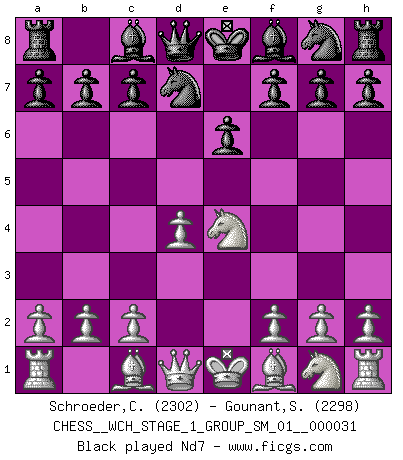 Last move : Nd7 2026 March 22 13:16:29 White clock - 31 days 13:45:30 Black clock - 32 days 23:11:56 [Event "FICGS__CHESS__WCH_STAGE_1_GROUP_SM_01__000031"] [Site "FICGS"] [Date "2026.03.20"] [Round "1"] [White "Schroeder,Christoph"] [Black "Gounant,Stanislas"] [Result "*"] [WhiteElo "2302"] [BlackElo "2298"] 1.e4 e6 2.d4 d5 3.Nc3 dxe4 4.Nxe4 Nd7 5.* Follow this game move after move (download)A thorough understanding of the typical mating continuations makes the most complicated sacrificial combinations leading up to them not only not difficult, but almost a matter of course. (Siegbert Tarrasch) Ein Großmeister muß tausende Partien in seinem Kopf speichern, denn diese sind für Ihn, was die Worte der Muttersprache für gewöhnliche Leute sind, oder Noten für Musiker... (Garry Kasparov) Dejen al perfeccionista jugar por correo. (Yasser Seirawan) Seul un grand joueur sait à quel point il joue faiblement. (Xavier Tartacover) No enterprise is more likely to succeed than one concealed from the enemy until it is ripe for execution. (Niccolo Machiavelli)