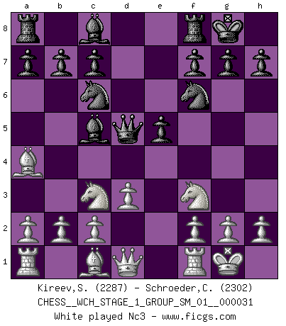 Last move : Qxd5 2026 March 23 8:48:0 White clock - 35 days 09:35:00 Black clock - 36 days 04:32:45 [Event "FICGS__CHESS__WCH_STAGE_1_GROUP_SM_01__000031"] [Site "FICGS"] [Date "2026.03.20"] [Round "1"] [White "Kireev,Sergey"] [Black "Schroeder,Christoph"] [Result "*"] [WhiteElo "2287"] [BlackElo "2302"] 1.e4 e5 2.Nf3 Nc6 3.Bb5 Nf6 4.d3 Bc5 5.Ba4 O-O 6.O-O d5 7.exd5 Qxd5 8.* Follow this game move after move (download)Chess is above all, a fight ! (Emanuel Lasker) Es war undenkbar für die Behörden, dass ein sowjetischer Großmeister auf diese Art und Weise [Fischer-Taimanov 6:0] verliert, ohne dass es eine politischer Erklärung dafür gäbe. (Mark Taimanov) A la fecha, Fischer esta simplemente un nivel arriba de todos los mejores jugadores de Ajedrez del mundo. (John Jacobs) Lorsque vous vous retrouvez devant une position atroce, ne tendez pas un ultime piège dérisoire avec l'intention d'abandonner si l'adversaire le déjoue ! Faites-vous plutôt un devoir de résister comme si votre vie en dépendait. Jouez le coup qui vous déplairait au centuple si vous étiez dans la peau de votre tortionnaire ! If you work for a living, why do you kill yourself working ? (Tuco to a chicken in The Good, The Bad and The Ugly)