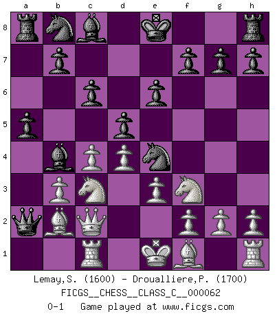 Last move : 0-1 2007 November 9 2:54:23 [Event "FICGS__CHESS__CLASS_C__000062"] [Site "FICGS"] [Date "2007.10.16"] [Round "1"] [White "Lemay,Simon"] [Black "Droualliere,Philippe"] [Result "0-1"] [WhiteElo "1600"] [BlackElo "1700"] 1.d4 d5 2.c4 c6 3.Nf3 Nf6 4.Nc3 e6 5.b3 Bb4 6.Bb2 Ne4 7.Qc2 Qa5 8.Rc1 Qxa2 9.e3 a5 0-1 QGD Slav : 4.Nc3 Player Black won this chess game. Follow this game move after move (download)It was clear to me that the vulnerable point of the American Grandmaster (Bobby Fischer) was in double-edged, hanging, irrational positions, where he often failed to find a win even in a won position. (Efim Geller) Es ist schade, dass viele Schachsportler vergessen, wie wichtig Auftreten und angemessene Kleidung sind. (Alexandra Kosteniuk) Tu eres para mi la Reina en d8 y yo soy el Peón en d7!!. (GM Eduard Gufeld) Ce qui est bien, c'est d'avoir tout un tas de pièces en prise : l'adversaire ne peut en prendre qu'une à la fois. Cité par Thierry Audin. If only faces could talk... (Pat Summerall, Sportscaster during the Super Bowl)