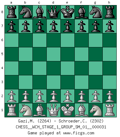 First move 2026 March 20 23:28:57 White clock - 27 days 17:40:56 Black clock - 30 days 00:00:00 [Event "FICGS__CHESS__WCH_STAGE_1_GROUP_SM_01__000031"] [Site "FICGS"] [Date "2026.03.20"] [Round "1"] [White "Gazi,Miroslav"] [Black "Schroeder,Christoph"] [Result "*"] [WhiteElo "2264"] [BlackElo "2302"] 1.* Follow this game move after move (download)I play correspondence chess because it is both art and science while chess is art only. (A player at FICGS) Die jungen Leute sollen verstehen, dass sie noch etwas von mir lernen können und müssen. (Viktor Kortschnoi) En manos de Fischer's, una diminuta ventaja teórica es tan buena como tener una Reina de ventaja. (Isaac Kashdan) Dans le domaine de la peinture, de la gravure et de la sculpture, dès la première décennie de notre siècle, les artistes abandonnent la représentation de la partie d'échecs pour se concentrer sur les pièces, sur les échiquiers et sur toutes les variations auxquelles les unes et les autres peuvent donner lieu. On passe en quelque sorte d'un thème social à un thème musical (au sens de la musica médiévale, c'est-à-dire d'une notion qui inclue le rythme, l'harmonie, la construction et la déconstruction, etc.). Graphiquement et picturalement, l'échiquier apparaît comme une structure ouverte, dynamique, d'une richesse infinie, autorisant toutes les combinatoires et débouchant sur des mouvements et des rythmes de nature exponentielle. (Michel Pastoureau) Mac users swear by their computers. PC users swear at their computers. (Author unknown)