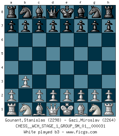Last move : b3 2026 March 20 23:51:23 White clock - 30 days 23:37:34 Black clock - 28 days 00:57:47 [Event "FICGS__CHESS__WCH_STAGE_1_GROUP_SM_01__000031"] [Site "FICGS"] [Date "2026.03.20"] [Round "1"] [White "Gounant,Stanislas"] [Black "Gazi,Miroslav"] [Result "*"] [WhiteElo "2298"] [BlackElo "2264"] 1.b3 * Follow this game move after move (download)First-class players lose to second-class players because second-class players sometimes play a first-class game. (Siegbert Tarrasch) Jede Eröffnung ist gut genug um gespielt zu werden, wenn nur ihr Ruf schlecht genug ist. (Savielly Grigorievitsch Tartakower) Yo he agregado estos principios a la ley: pongan los Caballos en acción antes de que los dos Alfiles sean desarrollados. (Emanuel Lasker) Ce n'est pas pour s'amuser qu'il joue aux échecs : il célèbre un culte. (Vladimir Nabokov) Thibault, I ask for draw. Game 13876. - Sorry Ilmars, you won. (FICGS chat)