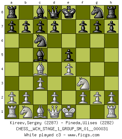 Last move : c3 2026 March 22 14:36:24 White clock - 32 days 20:18:00 Black clock - 32 days 07:35:57 [Event "FICGS__CHESS__WCH_STAGE_1_GROUP_SM_01__000031"] [Site "FICGS"] [Date "2026.03.20"] [Round "1"] [White "Kireev,Sergey"] [Black "Pineda,Ulises"] [Result "*"] [WhiteElo "2287"] [BlackElo "2282"] 1.e4 e5 2.Nf3 Nc6 3.Bc4 Bc5 4.c3 * Follow this game move after move (download)Chess is a sea in which a gnat may drink and an elephant may bathe. (Hindu proverb) Zeige mir drei Eröffnungsvarianten und ich beweise dir, dass zwei davon inkorrekt sind. (Emanuel Lasker) Debió haber existido una vez en que los hombres eran semidióses, de otra manera no hubiesen podido inventar el Ajedrez. (Gustav Schenk) Si le désir cupide (et stupide) de gagner est une inépuisable source de souffrance, une combinaison brillante sur l'échiquier est une découverte : le coquelicot qui s'épanouit lorsque apparaît la Voie Lactée. (Arrabal) There is a very easy way to return from a casino with a small fortune : go there with a large one. (Jack Yelton)