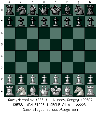 First move 2026 March 20 23:28:57 White clock - 28 days 02:14:10 Black clock - 30 days 00:00:00 [Event "FICGS__CHESS__WCH_STAGE_1_GROUP_SM_01__000031"] [Site "FICGS"] [Date "2026.03.20"] [Round "1"] [White "Gazi,Miroslav"] [Black "Kireev,Sergey"] [Result "*"] [WhiteElo "2264"] [BlackElo "2287"] 1.* Follow this game move after move (download)When you don't know what to do, wait for your opponent to get an idea - it's sure to be wrong. (Tarrasch) Es ist peinlich, dass ich nie Weltmeister wurde. Es wäre leicht, Leonid Breschnjew als Ursache vorzuschieben, dessen Apparat den Vorzeigekommunisten Anatoli Karpow in allem unterstützte. Aber Garri Kasparow zum Beispiel, der ebenfalls von den Sowjets unerwünscht war, hat trotz der Widerstände den WM-Titel erobert. (Viktor Kortschnoi) El Ajedrez es de 30 a 40 por ciento psicología. Uno no cuenta con esto cuando se juega contra una computadora. No lo puedo confundir. (Judith Polgar) La victoire dans une partie d'Echecs appartient la plupart du temps à celui qui voit un peu plus loin que l'adversaire. (Lasker) Heh, heh, heh. Time to abandon ship. (General Grievous in Star Wars ep.3)
