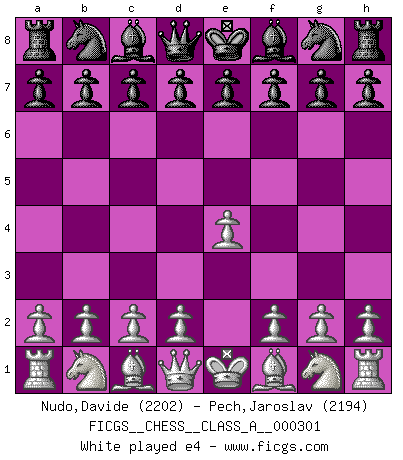 Last move : e4 2026 March 24 10:11:28 White clock - 39 days 22:25:31 Black clock - 39 days 20:47:11 [Event "FICGS__CHESS__CLASS_A__000301"] [Site "FICGS"] [Date "2026.03.24"] [Round "1"] [White "Nudo,Davide"] [Black "Pech,Jaroslav"] [Result "*"] [WhiteElo "2202"] [BlackElo "2194"] 1.e4 * Follow this game move after move (download)The winner of the game is the player who makes the next-to-last mistake. (Savielly Tartakover) Es gibt keine einzige Frau, der ich nicht einen Springer vorgeben könnte und trotzdem gewänne. (Robert James Fischer) Con el tiempo, empecé a progresar en partidas decisivas. Tal vez porque me di cuenta de una simple verdad: no solo estaba yo nervioso sino también mi oponente. (Mikhail Tal) Même un GMI sait rarement calculer sur plus de cinq coups une attaque à sacrifices. (Rudolf Spielmann) Luck is when opportunity knocks and you answer. (Anonymous)