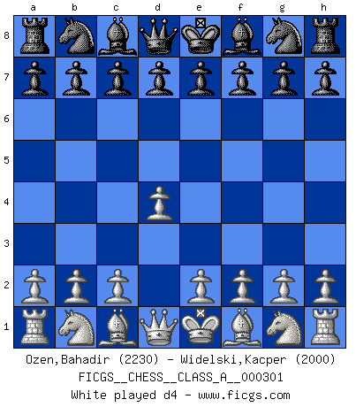 Last move : d4 2026 March 24 8:40:38 White clock - 39 days 23:56:21 Black clock - 39 days 17:40:49 [Event "FICGS__CHESS__CLASS_A__000301"] [Site "FICGS"] [Date "2026.03.24"] [Round "1"] [White "Ozen,Bahadir"] [Black "Widelski,Kacper"] [Result "*"] [WhiteElo "2230"] [BlackElo "2000"] 1.d4 * Follow this game move after move (download)When in doubt... play Chess ! (Tevis) Bogoljubow: Matt in vier Zügen! Tartakower: Ich verbitte mir jede Belästigung! (Savielly Grigorievitsch Tartakower) Muchos se han convertido en Maestros de Ajedrez, nadie se ha convertido en el Maestro del Ajedrez. (Siegbert Tarrasch) Les échecs sont plus proches de l'art de l'assassinat que de l'art de la guerre. (Arturo Perez-Reverte) Happy endings are just stories that haven't finished yet. (Jane Smith in Mr & Mrs Smith)