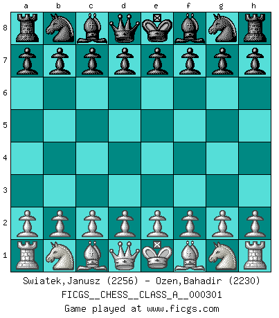 First move 2026 March 24 8:36:59 White clock - 39 days 16:20:39 Black clock - 40 days 00:00:00 [Event "FICGS__CHESS__CLASS_A__000301"] [Site "FICGS"] [Date "2026.03.24"] [Round "1"] [White "Swiatek,Janusz"] [Black "Ozen,Bahadir"] [Result "*"] [WhiteElo "2256"] [BlackElo "2230"] 1.* Follow this game move after move (download)If your opponent offers you a draw, try to work out why he thinks he's worse off. (Nigel Short) Nach Morphy wurde nichts neues mehr in der Behandlung offener Positionen gefunden. (Mikhail Moiseyevich Botvinik) Las combinaciones han sido siempre el aspecto más intrigante del Ajedrez. Los Maestros las buscan, el público las aplauden, los críticos las alaban. La razón se debe a que las combinaciones hacen posible que el Ajedrez sea más que un ejercicio matemático con una carencia de vida. Ellas son la poesía del juego, son del Ajedrez lo que la melodía es de la música. Ellas representan el triunfo de la mente sobre la materia. (Reuben Fine) Nous sommes les pions de la mystérieuse partie d'Echecs jouée par Dieu. Il nous déplace, nous arrête, nous pousse encore, puis nous lance un à un dans la boîte du Néant. Epitaphe sur la tombe de David Janowsky (1868-1927). Computer Science is no more about computers than astronomy is about telescopes. (Edsger W. Dijkstra)
