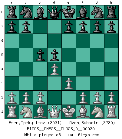 Last move : e3 2026 March 24 13:49:49 White clock - 39 days 21:09:52 Black clock - 39 days 19:10:47 [Event "FICGS__CHESS__CLASS_A__000301"] [Site "FICGS"] [Date "2026.03.24"] [Round "1"] [White "Eser,Ipekyilmaz"] [Black "Ozen,Bahadir"] [Result "*"] [WhiteElo "2031"] [BlackElo "2230"] 1.d3 d5 2.d4 c5 3.e3 * Follow this game move after move (download)The only thing Chess players have in common is Chess. (Lodewijk Prins) Ich bewundere Kasparows phantasievolle Angriffssiege aus den Achtzigern und Neunzigern, aber wenn man sie mit dem Computer überprüft, nimmt der Computer in jeder zweiten Partie die Opfer an, verteidigt sich und gewinnt. (Vladimir Kramnik) Muchos jugadores de Ajedrez se sorprendían cuando después de la partida, Fischer explicaba con calma: 'Yo ya había analizado esta posibilidad' en una posición en la cual yo creía que no era posible de prever desde la apertura. (Mikhail Tal) Je ne suis pas le dernier à jouer lâchement des coups douteux pendant le zeïtnot de l'adversaire pour l'achever: en effet les coups qui font le plus peur sont ceux que l'on ne comprend pas. Je me fais souvent peur quand je joue. (Un professeur anonyme) Chess is as much a mystery as women. (Purdy)