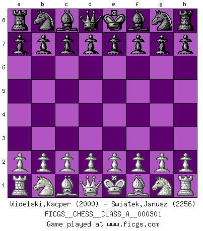First move 2026 March 24 8:36:59 White clock - 39 days 16:20:39 Black clock - 40 days 00:00:00 [Event "FICGS__CHESS__CLASS_A__000301"] [Site "FICGS"] [Date "2026.03.24"] [Round "1"] [White "Widelski,Kacper"] [Black "Swiatek,Janusz"] [Result "*"] [WhiteElo "2000"] [BlackElo "2256"] 1.* Follow this game move after move (download)The stomach is an essential part of the Chess master. (Bent Larsen) Deine Wertungszahl - vorausgesetzt einige Jahre schachliche Anstrengung - entspricht etwa dem zehnfachen Deines IQ plus 1000. (Jonathan Levitt) Siempre es mucho mejor sacrificar las piezas de tu oponente. (Savielly Tartakover) Si le désir cupide (et stupide) de gagner est une inépuisable source de souffrance, une combinaison brillante sur l'échiquier est une découverte : le coquelicot qui s'épanouit lorsque apparaît la Voie Lactée. (Arrabal) True nature is revealed in times of difficulty. (Chinese proverb)