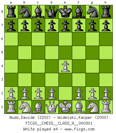 Last move : e4 2026 March 24 10:12:52 White clock - 39 days 22:24:07 Black clock - 39 days 17:56:32 [Event "FICGS__CHESS__CLASS_A__000301"] [Site "FICGS"] [Date "2026.03.24"] [Round "1"] [White "Nudo,Davide"] [Black "Widelski,Kacper"] [Result "*"] [WhiteElo "2202"] [BlackElo "2000"] 1.e4 * Follow this game move after move (download)Chess is life. (Bobby Fischer) Ein Kibitz ist einer, der deinem Gegner gute Ratschläge gibt. (Andrew Soltis) Los Peones son nacidos libres, y aún así, se encuentran encadenados por todos lados. (Rick Kennedy) Fischer est le meilleur joueur du monde et Karpov n'est qu'un joueur de bistrot. (Garry Kasparov, agé de 16 ans) In my experience, there's no such thing as luck. (Obi-Wan Kenobi in Star Wars ep.4)