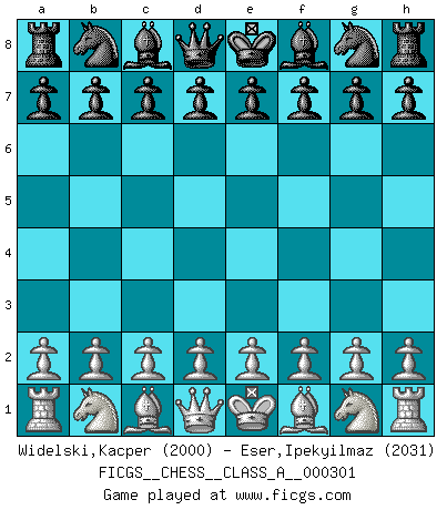 First move 2026 March 24 8:36:59 White clock - 39 days 16:20:40 Black clock - 40 days 00:00:00 [Event "FICGS__CHESS__CLASS_A__000301"] [Site "FICGS"] [Date "2026.03.24"] [Round "1"] [White "Widelski,Kacper"] [Black "Eser,Ipekyilmaz"] [Result "*"] [WhiteElo "2000"] [BlackElo "2031"] 1.* Follow this game move after move (download)A bad day of Chess is better than any good day at work. (Anonymous) Jeder Fehler erscheint unglaublich dumm, wenn andre ihn begehen. (Georg Christoph Lichtenberg) Cuando tengas duda... ¡juega al Ajedrez!. (Tevis) Avec des compensations pour le matériel en plus... (Anonyme) Men never do evil so completely and cheerfully as when they do it from religious conviction. (Blaise Pascal)