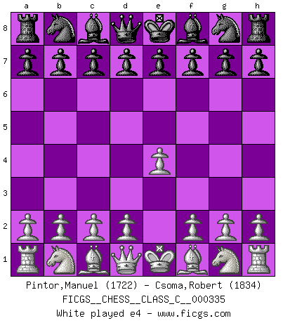 Last move : e4 2026 March 31 0:55:17 White clock - 39 days 21:18:20 Black clock - 39 days 15:10:24 [Event "FICGS__CHESS__CLASS_C__000335"] [Site "FICGS"] [Date "2026.03.30"] [Round "1"] [White "Pintor,Manuel"] [Black "Csoma,Robert"] [Result "*"] [WhiteElo "1722"] [BlackElo "1834"] 1.e4 * Follow this game move after move (download)Pawns are born free, yet they are everywhere in chains. (Rick Kennedy) Habe Mut, dich deines eigenen Verstandes zu bedienen. (Immanuel Kant) Los Peones son nacidos libres, y aún así, se encuentran encadenados por todos lados. (Rick Kennedy) Nous sommes les pions de la mystérieuse partie d'Echecs jouée par Dieu. Il nous déplace, nous arrête, nous pousse encore, puis nous lance un à un dans la boîte du Néant. Epitaphe sur la tombe de David Janowsky (1868-1927). I have opinions of my own - strong opinions - but I don't always agree with them. (George Bush)