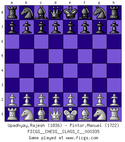 First move 2026 March 30 22:13:37 White clock - 39 days 15:15:03 Black clock - 40 days 00:00:00 [Event "FICGS__CHESS__CLASS_C__000335"] [Site "FICGS"] [Date "2026.03.30"] [Round "1"] [White "Upadhyay,Rajesh"] [Black "Pintor,Manuel"] [Result "*"] [WhiteElo "1836"] [BlackElo "1722"] 1.* Follow this game move after move (download)The hardest game to win is a won game. (Emanuel Lasker) Er war ein guter Schachspieler, aber ich kann Leute nicht ausstehen, die 'Heil Hitler' rufen (Über Alexander Aljechin). (Miguel Najdorf) No nos podemos resistir a la fascinación de un sacrificio ya que la pasión por los sacrificios es parte de la naturaleza de un jugador de Ajedrez. (Rudolf Spielman) Aux échecs, l'amour-propre est satisfait quand on remporte la victoire, mais il n'y a pas de honte à être battu. (Benjamin Franklin) He who fights with monsters should be careful lest he thereby become a monster. (Friedrich Nietzsche, Beyond Good and Evil)