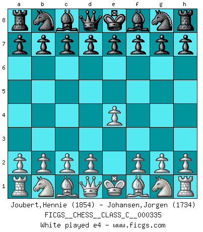 Last move : e4 2026 March 30 22:13:59 White clock - 39 days 23:59:38 Black clock - 39 days 13:53:47 [Event "FICGS__CHESS__CLASS_C__000335"] [Site "FICGS"] [Date "2026.03.30"] [Round "1"] [White "Joubert,Hennie"] [Black "Johansen,Jorgen"] [Result "*"] [WhiteElo "1854"] [BlackElo "1734"] 1.e4 * Follow this game move after move (download)Chess, like love, like music, has the power to make people happy. (Siegbert Tarrasch) Schach ist ein Reich, wo sich die menschliche Phantasie frei entfalten kann. (David Bronstein) El Ajedrez, como la música, como el amor, tiene el poder de hacer feliz a la gente. (Siegbert Tarrasch) Karpov est une pièce de musée. (Garry Kasparov) Thibault, I ask for draw. Game 13876. - Sorry Ilmars, you won. (FICGS chat)