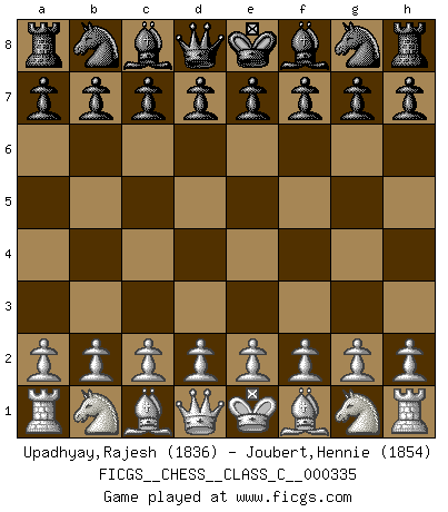First move 2026 March 30 22:13:37 White clock - 39 days 15:15:03 Black clock - 40 days 00:00:00 [Event "FICGS__CHESS__CLASS_C__000335"] [Site "FICGS"] [Date "2026.03.30"] [Round "1"] [White "Upadhyay,Rajesh"] [Black "Joubert,Hennie"] [Result "*"] [WhiteElo "1836"] [BlackElo "1854"] 1.* Follow this game move after move (download)Chess is a forcing house where the fruits of character can ripen more fully than in life. (Edward Morgan Foster) Über Karpov: Er war und ist ein Vertreter der russischen Reaktionäre. Das steckt tief in seiner Seele, wehalb ich nicht nett mit ihm umgehen kann. (Viktor Kortschnoi) Todo lo que importa ante el tablero de Ajedrez son buenas jugadas. (Bobby Fischer) Le pion, dans sa simplicité, marche droit devant lui, mais lorsqu'il prend, il le fait obliquement? Ainsi l'homme, tant qu'il reste pauvre, marche dans la droiture et vit honnêtement, mais lorsqu'il recherche les honneurs, il flatte, se parjure et, par les voies obliques, cherche une position supérieure sur l'échiquier du monde. (Jean de Galles) Art is the triumph over chaos. (John Cheever)