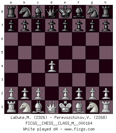 Last move : d4 2026 April 5 4:9:6 White clock - 39 days 15:39:14 Black clock - 38 days 21:19:09 [Event "FICGS__CHESS__CLASS_M__000164"] [Site "FICGS"] [Date "2026.04.04"] [Round "1"] [White "LaDuke,Matt"] [Black "Perevozchikov,Vjacheslav"] [Result "*"] [WhiteElo "2326"] [BlackElo "2268"] 1.d4 * Follow this game move after move (download)Chess is so inspiring that I do not believe a good player is capable of having an evil thought during the game. (Wilhelm Steinitz) Intelligenz läßt sich nicht am Weg, sondern nur am Ergebnis feststellen. (Garry Kasparov) ¡Examina movidas que hagan daño! Un buen ojo for movidas desvastantes es mucho mas importante que el conocimiento de principios estratégicos. (Purdy) Si rien de grave n'est détecté lors de l'analyse d'une position, on joue alors le coup. Seconde règle de Blumenfeld. If you are going through hell, keep going. (Winston Churchill)