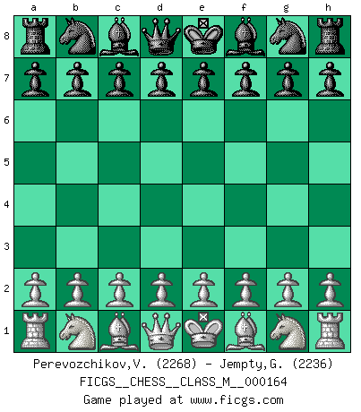 First move 2026 April 4 19:48:20 White clock - 38 days 12:46:25 Black clock - 40 days 00:00:00 [Event "FICGS__CHESS__CLASS_M__000164"] [Site "FICGS"] [Date "2026.04.04"] [Round "1"] [White "Perevozchikov,Vjacheslav"] [Black "Jempty,George"] [Result "*"] [WhiteElo "2268"] [BlackElo "2236"] 1.* Follow this game move after move (download)No Chess Grandmaster is normal; they only differ in the extent of their madness. (Viktor Korchnoi) Bis zum Jahr 1971 verlief in meiner Schachkariere alles glatt. Dieses dramatische Match [Fischer-Taimanov 6:0] machte mein Leben zur Hölle. (Mark Taimanov) El juego del Ajedrez no es solamente una diversión quieta; algunas cualidades muy valuables de la mente se pueden adquirir y cultivar con el, como convertirlos en habitos disponibles para toda ocasión; ya que la vida es algo así como el Ajedrez. (Benjamin Franklin) La vérité est comme le meilleur coup aux échecs : elle existe, mais il faut la chercher. (Arturo Perez-Reverte) Either move or be moved. (Ezra Pound)