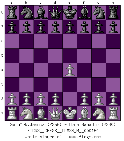 Last move : e4 2026 April 5 22:10:40 White clock - 38 days 21:37:40 Black clock - 39 days 23:40:18 [Event "FICGS__CHESS__CLASS_M__000164"] [Site "FICGS"] [Date "2026.04.04"] [Round "1"] [White "Swiatek,Janusz"] [Black "Ozen,Bahadir"] [Result "*"] [WhiteElo "2256"] [BlackElo "2230"] 1.e4 * Follow this game move after move (download)Live, lose, and learn, by observing your opponent how to win. (Amber Steenbock) Wenn ich einen Club besuche, sind die Spieler stumm vor Staunen. (José Raúl Capablanca) Nos gusta pensar. (Gary Kasparov) Il vaut mieux sacrifier les pièces de l'adversaire. (Xavier Tartacover) The obstacle is the path. (Zen proverb)