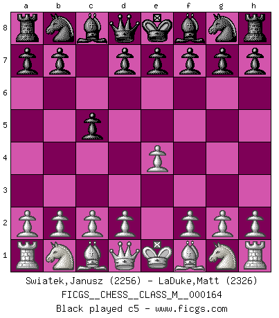 Last move : e4 2026 April 5 22:10:44 White clock - 38 days 21:37:36 Black clock - 39 days 23:40:23 [Event "FICGS__CHESS__CLASS_M__000164"] [Site "FICGS"] [Date "2026.04.04"] [Round "1"] [White "Swiatek,Janusz"] [Black "LaDuke,Matt"] [Result "*"] [WhiteElo "2256"] [BlackElo "2326"] 1.e4 * Follow this game move after move (download)No other master has such a terrific will to win. At the board he radiates danger, and even the strongest opponents tend to freeze, like rabbits when they smell a panther. Even his weaknesses are dangerous. As white, his opening game is predictable - you can make plans against it - but so strong that your plans almost never work. In the middle game his precision and invention are fabulous, and in the end game you simply cannot beat him. (Anonymous German Expert) Kein Schachspieler kann gut schlafen. (H. G. Wells) Los Peones son nacidos libres, y aún así, se encuentran por doquier encadenados. (Rick Kennedy) Aux échecs, l'amour-propre est satisfait quand on remporte la victoire, mais il n'y a pas de honte à être battu. (Benjamin Franklin) Every vice is only an exaggeration of a necessary and virtuous function. (Ralph Waldo Emerson, Journals 1936)