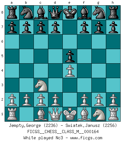 Last move : e5 2026 April 5 22:11:44 White clock - 39 days 00:56:37 Black clock - 39 days 20:21:22 [Event "FICGS__CHESS__CLASS_M__000164"] [Site "FICGS"] [Date "2026.04.04"] [Round "1"] [White "Jempty,George"] [Black "Swiatek,Janusz"] [Result "*"] [WhiteElo "2236"] [BlackElo "2256"] 1.e4 e5 2.* Follow this game move after move (download)Help your pieces so they can help you. (Paul Morphy) Wer nie einen Fehler gemacht hat, hat nie etwas Neues ausprobiert. (Albert Einstein) Si pudieramos observar el interior de la cabeza de un jugador de Ajedrez, encontraríamos ahí un mundo lleno de sentimientos, imágenes, ideas, emoción y pasión. (Alfred Binet) C'est une question de caractère, Beaucoup de gens perdent leur motivation très vite. D'autres, ils sont rares, peuvent la conserver très longtemps. J'aime les échecs, encore aujourd'hui je suis heureux d'analyser des parties. J'aime toujours gagner, je déteste encore perdre. Bien jouer est important pour mon intégrité intellectuelle et morale. Et puis les échecs vivent en ce moment une période historique grâce à Internet. Ils se développent dans les systèmes éducatifs à travers le monde. Ils sortent de leur ghetto, et c'est mon rôle de mener à bien cette révolution. (Gary Kasparov) You can't play chess if you're groggy from pills. (Anatoly Karpov)