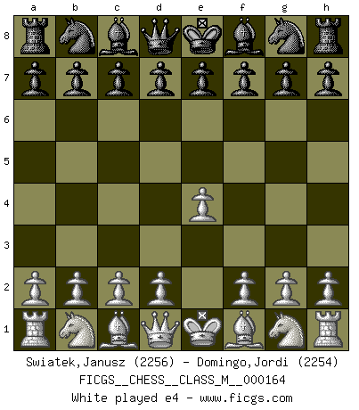 Last move : e4 2026 April 5 22:10:49 White clock - 38 days 21:37:31 Black clock - 39 days 23:40:28 [Event "FICGS__CHESS__CLASS_M__000164"] [Site "FICGS"] [Date "2026.04.04"] [Round "1"] [White "Swiatek,Janusz"] [Black "Domingo,Jordi"] [Result "*"] [WhiteElo "2256"] [BlackElo "2254"] 1.e4 * Follow this game move after move (download)By playing at Chess then, we may learn: First: Foresight... Second: Circumspection... Third: Caution... And lastly, we learn by Chess the habit of not being discouraged by present bad appearances in the state of our affairs, the habit of hoping for a favorable chance, and that of persevering in the secrets of resources. (Benjamin Franklin) Alle Schachspieler sollten auch ein Hobby haben. (Savielly Grigorievitsch Tartakower) Me siento como si fuera una pieza en una partida de Ajedrez, cuando mi oponente me indica: esa pieza no puede ser movida. (Soren Kierkegaard) Fischer est le meilleur joueur du monde et Karpov n'est qu'un joueur de bistrot. (Garry Kasparov, agé de 16 ans) You can think I'm wrong, but that's no reason to quit thinking. (Gregory House, House M.D.)