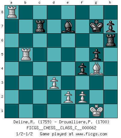 Last move : 1/2-1/2 2007 November 26 9:5:28 [Event "FICGS__CHESS__CLASS_C__000062"] [Site "FICGS"] [Date "2007.10.16"] [Round "1"] [White "Deline,Ralph"] [Black "Droualliere,Philippe"] [Result "1/2-1/2"] [WhiteElo "1759"] [BlackElo "1700"] 1.c4 e5 2.g3 Nf6 3.Bg2 d5 4.cxd5 Nxd5 5.Nc3 Nb6 6.Nf3 Nc6 7.O-O Be7 8.a3 O-O 9.d3 Be6 10.Be3 Nd5 11.Nxd5 Bxd5 12.Rc1 f5 13.Qd2 Nd4 14.Bxd4 exd4 15.Rfe1 c6 16.Qf4 Bxf3 17.Qxf3 a5 18.Rc2 Bg5 19.Rb1 a4 20.b4 axb3 21.Rxb3 Rf7 22.Rcb2 Ra7 23.Rb1 g6 24.h4 Bh6 25.a4 Qe8 26.h5 g5 27.Bh3 Qc8 28.g4 f4 29.Rb4 Qd7 30.Qe4 Bg7 31.h6 Bf6 32.Qf5 Qxf5 33.gxf5 Rd7 34.Bg4 Be7 35.Rc4 Bd8 36.Bf3 Be7 37.Bg4 Rd6 38.f6 Bd8 39.Rc5 Bxf6 40.Bc8 b5 41.axb5 cxb5 42.Rcxb5 Bd8 43.R1b4 Rc7 44.Bg4 Rxh6 45.Rxd4 Be7 46.Ra4 Kg7 47.Ra8 1/2-1/2 English Opening Kingside Castling by player White (move 7) Kingside Castling by player Black (move 8) This chess game ended in a draw. Follow this game move after move (download)Let the perfectionist play postal. (Yasser Seirawan) Ein typischer, sehr verbreiteter Gedankenschädling ist der, daß der betreffende Amateur von der Annanhme ausgeht, daß jeder einzelne Zug etwas zu leisten habe. (Aaron Nimzowitsch) Cuando me preguntan: -¿Cual es el secreto que te hace hacer mejores movidas que tus oponentes?, Yo respondo: Me da gusto que me pregunten eso, porque, como veran, hay una simple razón. Yo pienso mis propias movidas y dejo a mi oponente que el piense las suyas. (Alexander Alekhine) Aucun coup ne doit être joué sans but. (Pedro Damiano) Experience is the name we all give to our mistakes. (Oscar Wilde)