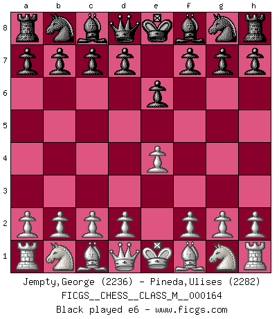 Last move : e6 2026 April 6 1:13:23 White clock - 38 days 21:41:31 Black clock - 39 days 17:19:50 [Event "FICGS__CHESS__CLASS_M__000164"] [Site "FICGS"] [Date "2026.04.04"] [Round "1"] [White "Jempty,George"] [Black "Pineda,Ulises"] [Result "*"] [WhiteElo "2236"] [BlackElo "2282"] 1.e4 e6 2.* Follow this game move after move (download)I love all positions. Give me a difficult positional game, I will play it. But totally won positions, I cannot stand them. (Hein Donner) Wenn Dein Gegner dir ein Remis anbietet, versuch herauszufinden, weshalb er glaubt schlechter zu stehen. (Nigel Short) El Ajedrez es un regaderazo frío para la mente. (Sir John Simon) Les échecs c'est le défi de l'alpiniste, toujours plus haut, prêt à tout pour monter à l'assaut du Roi ennemi. Les échecs, c'est de la musique en mouvement, un ballet majestueux pour les yeux. C'est de la poésie composée par les fantômes du passé qui au même titre que Rimbaud ou Verlaine méritent notre admiration. Les échecs, c'est de la peinture ou le moindre mouvement modifie le tableau pour en faire un Picasso ou un Van Gogh. Les échecs, c'est tout et rien, c'est la vie et la mort. Jjulie33 sur le forum de France-Echecs. Computer Science is no more about computers than astronomy is about telescopes. (Edsger W. Dijkstra)