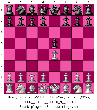 Last move : e5 2026 April 5 22:11:48 White clock - 30 days 21:08:16 Black clock - 29 days 22:59:14 [Event "FICGS__CHESS__RAPID_M__000183"] [Site "FICGS"] [Date "2026.04.04"] [Round "1"] [White "Ozen,Bahadir"] [Black "Swiatek,Janusz"] [Result "*"] [WhiteElo "2230"] [BlackElo "2256"] 1.e4 e5 2.* Follow this game move after move (download)Your body has to be in top condition. Your Chess deteriorates as your body does. You can't separate body from mind. (Bobby Fischer) Mit Schach schule ich mein Gefühl für Geometrie, was für Tennis und Schach gleichermaßen wichtig ist. (Boris Becker) Nos gusta pensar. (Gary Kasparov) Toutes choses étant égales, c'est la conviction qui gagne. Alliée à une volonté de vaincre, elle sert de détonateur, suscite des idées, disperse les doutes et aide à penser clairement. (Robert Fischer) Nowadays, anyone who cannot speak English and is incapable of using the Internet is regarded as backward. (Al-Waleed bin Talal)