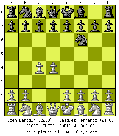 Last move : Nf6 2026 April 5 0:20:25 White clock - 30 days 15:03:43 Black clock - 30 days 20:50:40 [Event "FICGS__CHESS__RAPID_M__000183"] [Site "FICGS"] [Date "2026.04.04"] [Round "1"] [White "Ozen,Bahadir"] [Black "Vasquez,Fernando"] [Result "*"] [WhiteElo "2230"] [BlackElo "2176"] 1.d4 Nf6 2.* Follow this game move after move (download)I still hope to kill Fischer. (Boris Spassky) Es liegt in der Natur, vernüftig zu denken und unlogisch zu handeln. (Anatole France) No hay precio que no valga la pena por la cabellera del Rey enemigo. (Koblentz) Même si l'adversaire joue le coup analysé précédemment, recommencez l'analyse en voyant la nouvelle position. Première règle de Blumenfeld We cannot be sure of having something to live for unless we are willing to die for it. (Ernesto Che Guevara)