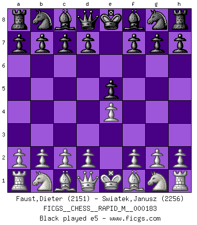 Last move : e5 2026 April 5 22:12:3 White clock - 30 days 10:10:11 Black clock - 30 days 09:57:20 [Event "FICGS__CHESS__RAPID_M__000183"] [Site "FICGS"] [Date "2026.04.04"] [Round "1"] [White "Faust,Dieter"] [Black "Swiatek,Janusz"] [Result "*"] [WhiteElo "2151"] [BlackElo "2256"] 1.e4 e5 2.* Follow this game move after move (download)Bobby Fischer's current state of mind is indeed a tragedy. One of the world's greatest Chess players - the pride and sorrow of American Chess. (Frank Brady) Woher wissen wir, daß der Neanderthaler Blindschach gespielt hat? -- Bei Ausgrabungen wurden keine Schachbretter und Figuren gefunden. (Anonymous) Aquellos que dicen entender al Ajedrez, no entienden nada. (Robert Hubner) Mon pion favori sur ma case favorite ! Bronstein en parlant d'un coup de pion en h5 quand il avait les Noirs. The message for business people contemplating their place in the cyberspace is simple and direct: get linked or get lost. (Vic Sussman and Kenan Pollack)