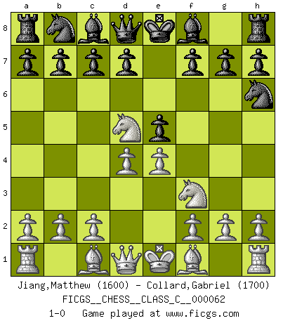 Last move : 1-0 2007 December 1 8:3:14 [Event "FICGS__CHESS__CLASS_C__000062"] [Site "FICGS"] [Date "2007.10.16"] [Round "1"] [White "Jiang,Matthew"] [Black "Collard,Gabriel"] [Result "1-0"] [WhiteElo "1600"] [BlackElo "1700"] 1.e4 e5 2.Nf3 Qf6 3.Nc3 Nh6 4.Nd5 Qd8 5.d4 1-0 This chess game has been lost on time (started : 2007.10.16 0:16:13) Greco defense Player White won this chess game. Follow this game move after move (download)The passion for playing Chess is one of the most unaccountable in the world. (H.G. Wells) Frage: Was machen Sie mit den Preisen? Anwort: Ich habe Angst, dass meine Freundin davon neue Kleider kauft. (Loek van Wely) Aunque la mayoría de la gente disfruta observar las partidas de los grandes Maestros de ataque, algunos de los jugadores mas notables en la historia han sido los jugadores silenciosos posicionales. Lentamente ellos te aplastan despojandote de tu espacio, congestionando tus piezas y dejandote virtualmente sin nada que hacer. (Yasser Seirawan) Mais n'est-ce pas déjà le limiter injurieusement que d'appeler les échecs un jeu? N'est-ce pas aussi une science, un art, ou quelque chose qui, comme le cercueil de Mahomet entre ciel et terre, est suspendu entre l'un et l'autre, et qui réunit un nombre incroyable de contraires ? (Stefan Zweig) Political correctness is subjecting us to gross incompetence. (Johann Piek)