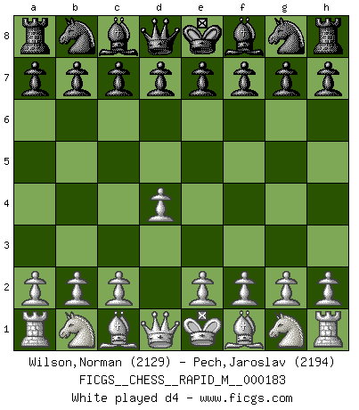Last move : d4 2026 April 5 7:58:24 White clock - 30 days 11:50:08 Black clock - 29 days 17:14:50 [Event "FICGS__CHESS__RAPID_M__000183"] [Site "FICGS"] [Date "2026.04.04"] [Round "1"] [White "Wilson,Norman"] [Black "Pech,Jaroslav"] [Result "*"] [WhiteElo "2129"] [BlackElo "2194"] 1.d4 * Follow this game move after move (download)The blunders are all there on the board, waiting to be made. (Savielly Tartakover) Intelligenz läßt sich nicht am Weg, sondern nur am Ergebnis feststellen. (Garry Kasparov) El tablero es el mundo, las piezas es el fenomeno del universo, las reglas del juego son lo que llamamos leyes de la naturaleza y el jugador del lado opuesto, se encuentra oculto a nuestra vista. (Thomas Huxley) La tactique est l'élément le plus important du milieu de jeu. (Siegbert Tarrasch) Ah, beer! The cause of, and the solution to, all of life's problems. (Homer Simpson)